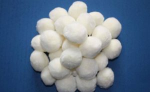 ◆改性纖維的質(zhì)量標(biāo)準(zhǔn)中捆扎強度是一個重要指標(biāo),有的廠家生產(chǎn)的纖維球指標(biāo)較低,丘陵污水處理裝置的過濾器曾使用ф0.2mm的纖維絲,吊0.3kg重物無脫落現(xiàn)象的纖維球,使用一個月后,纖維球大量散開.形成棉絮塊,堵塞篩網(wǎng)又不易清洗,只能更換。后改用ф0.lmm的纖維絲吊05kg重物無脫落現(xiàn)象的纖維球纖維球無散開現(xiàn)象,只有脫絲現(xiàn)象。